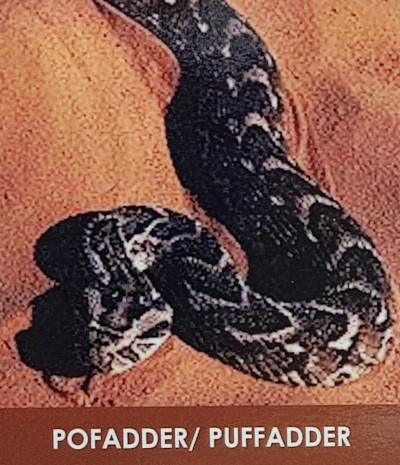 Viperidae: pofadder, Gaboen-adder, nagadder, bergadder, horingadder.