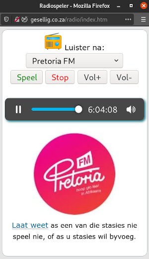 Ons het pas 'n radiospeler op die werf beskikbaar gestel waarmee luisteraars vinnig tussen Afrikaanse stasie kan spring. Ons hoop dat mense dit vir agtergrondvermaak kan gebruik terwyl hulle op die internet rondspeel.